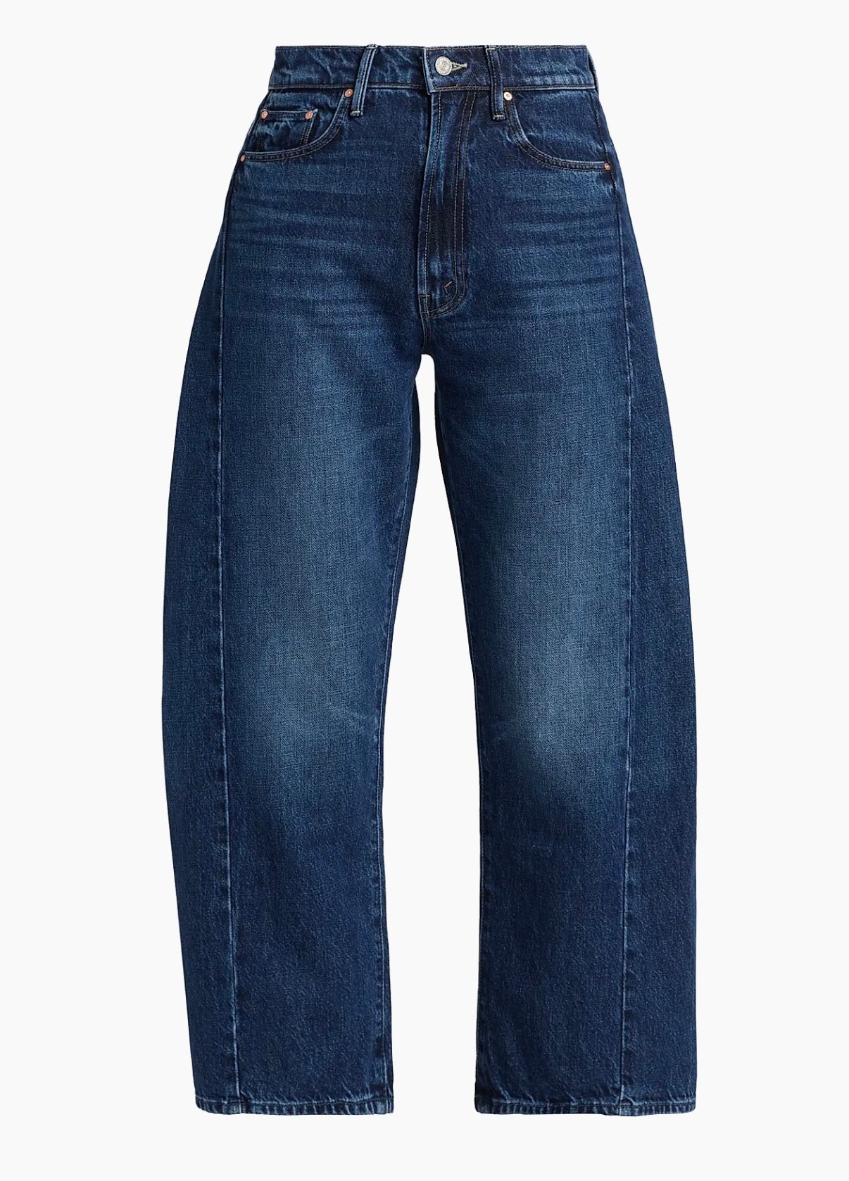 High hopes. A super high-waisted jean with a wide, curved leg, an ankle-length inseam and a clean hem. Made from SUPERIOR denim, Did You Bring Me Anything? is a dark blue wash with whiskering and fading at the knees.
