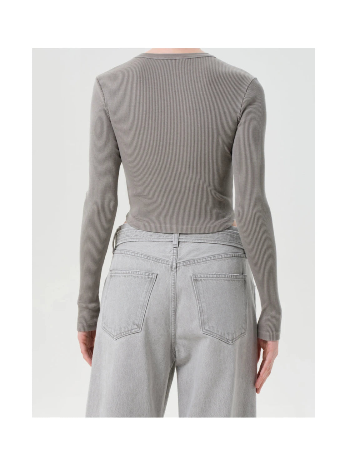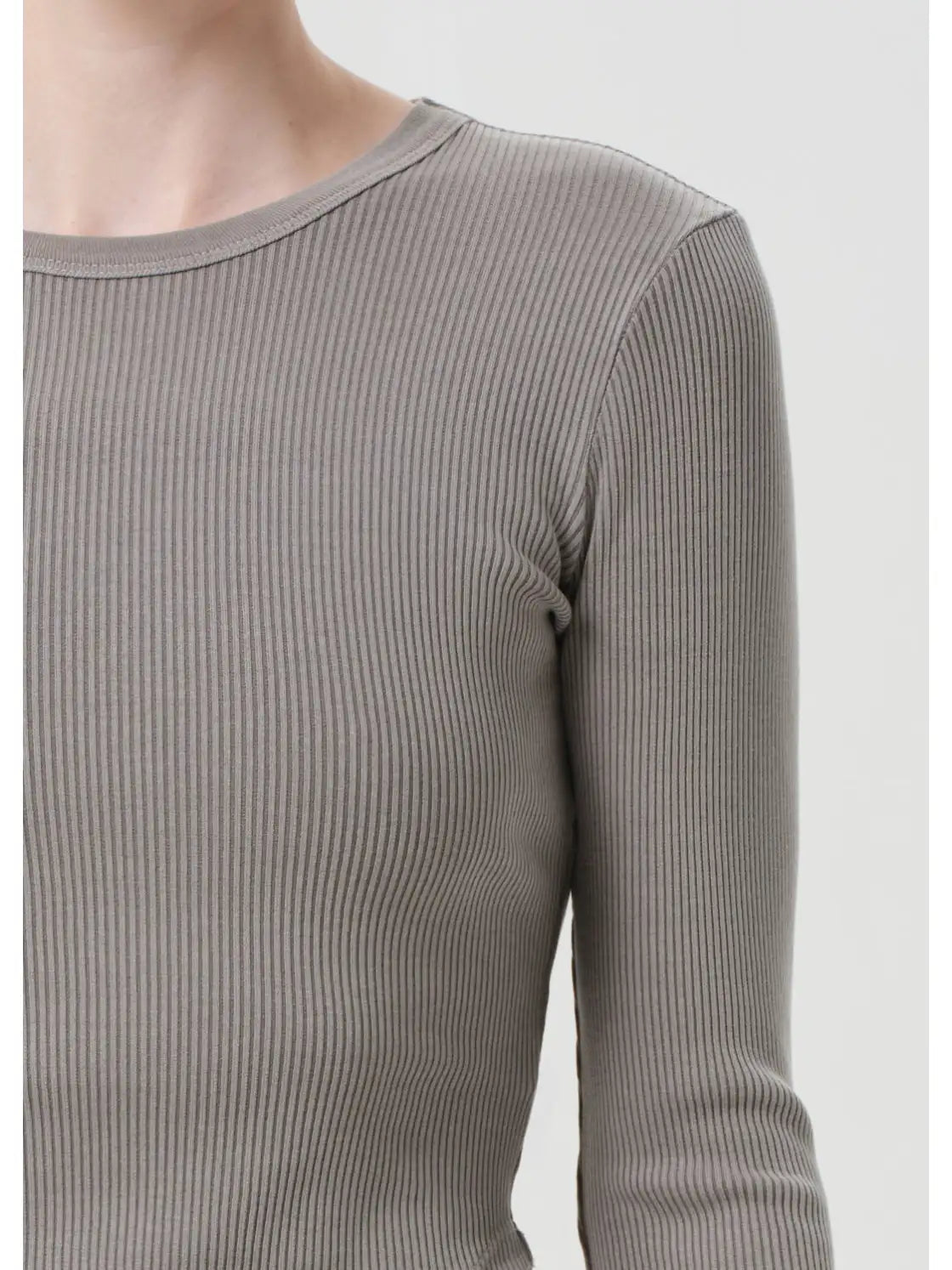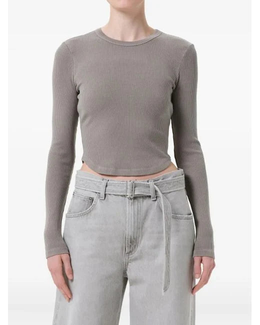 Long sleeves, curved hem, ribbed design.